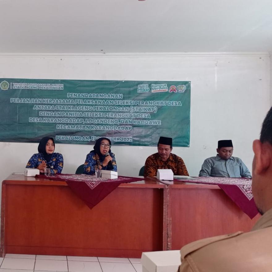 Berikut telah diselenggarakan acara Penandatangan perjanjian kerjasama pelaksanaan seleksi perangkat desa antara STAI Ki Ageng Pekalongan (STAIKAP) dengan panitia seleksi perangkat desa, (Desa Karangdadap, Logandeng, dan Kaligawe) Kecamatan Karangdadap Kabupaten Pekalongan.