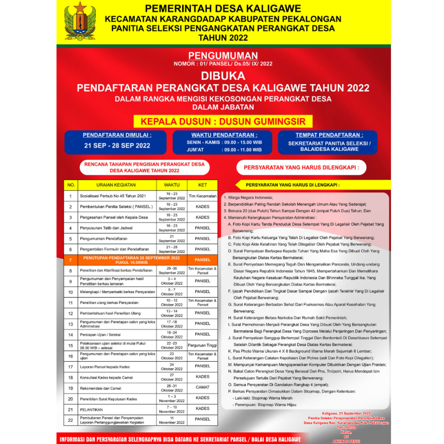 Rencana Tahapan dan Persyaratan Penjaringan Perangkat Desa Kaligawe Formasi Jabatan Kepala Dusun Gumingsir.